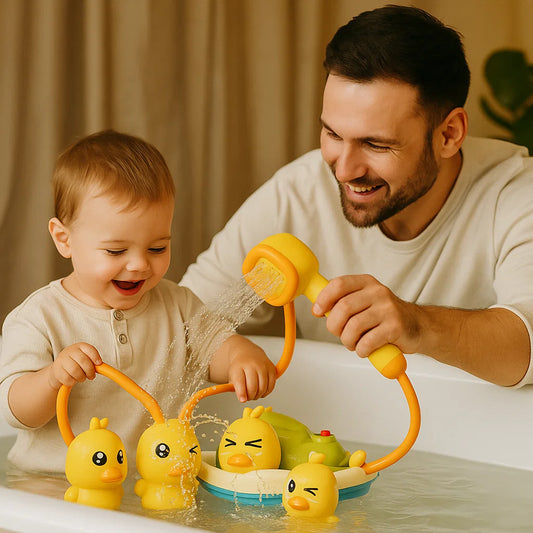 Baby-Badespielzeug-Set ⎜ Lustige Wasserspritzenten mit Motorboot für interaktives Spielen beim Baden