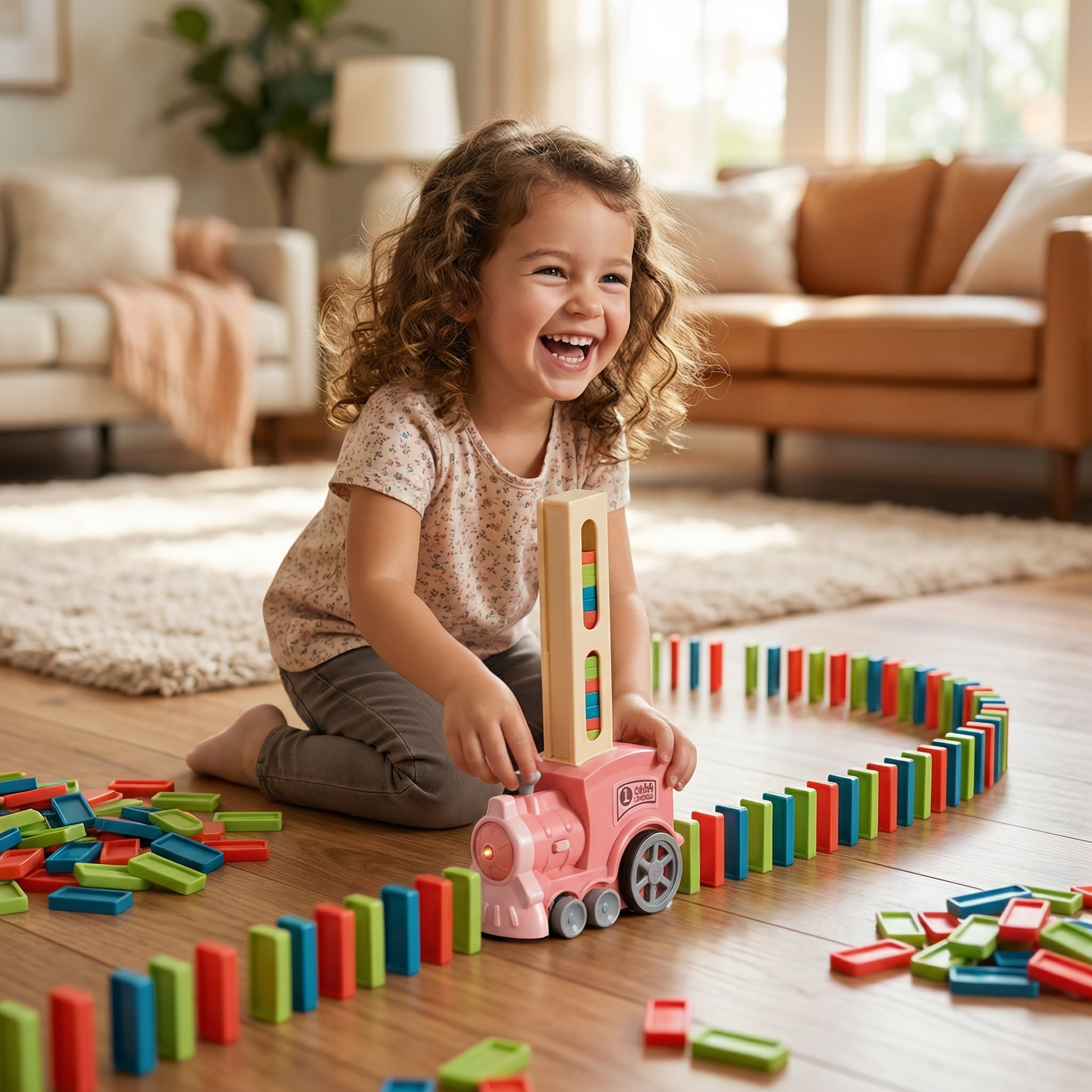 Eltern werden die automatische Schienenlegungsfunktion lieben, die Chaos minimiert und den Spielspaß maximiert. Einfach die Dominosteine laden, einschalten und zusehen, wie der Zug einen bunten Weg voller Spannung baut.