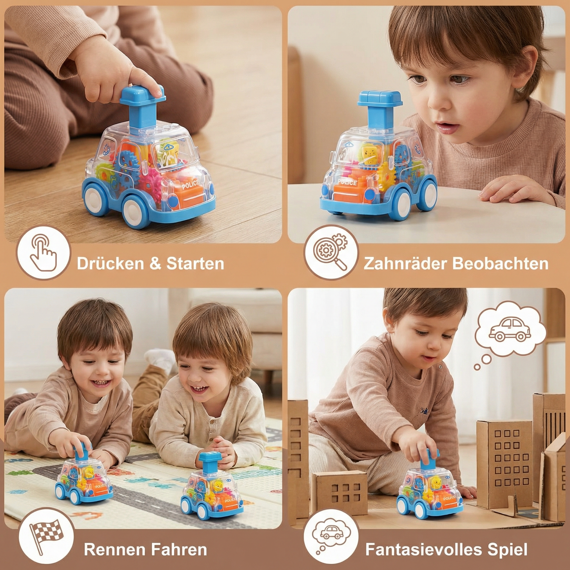 Die Drück und Los – Zahnrad Spielautos bringen Action und Spaß direkt in die Hände Ihrer Kinder! Mit nur einem Druck auf das Fahrzeug startet es durch und sorgt für eine spannende Fahrt. Die Zahnradmechanik fasziniert nicht nur durch die Geschwindigkeit der Autos, sondern fördert auch das Verständnis für einfache technische Zusammenhänge. Ideal für neugierige Entdecker, die spielerisch lernen und gleichzeitig jede Menge Spaß haben möchten!