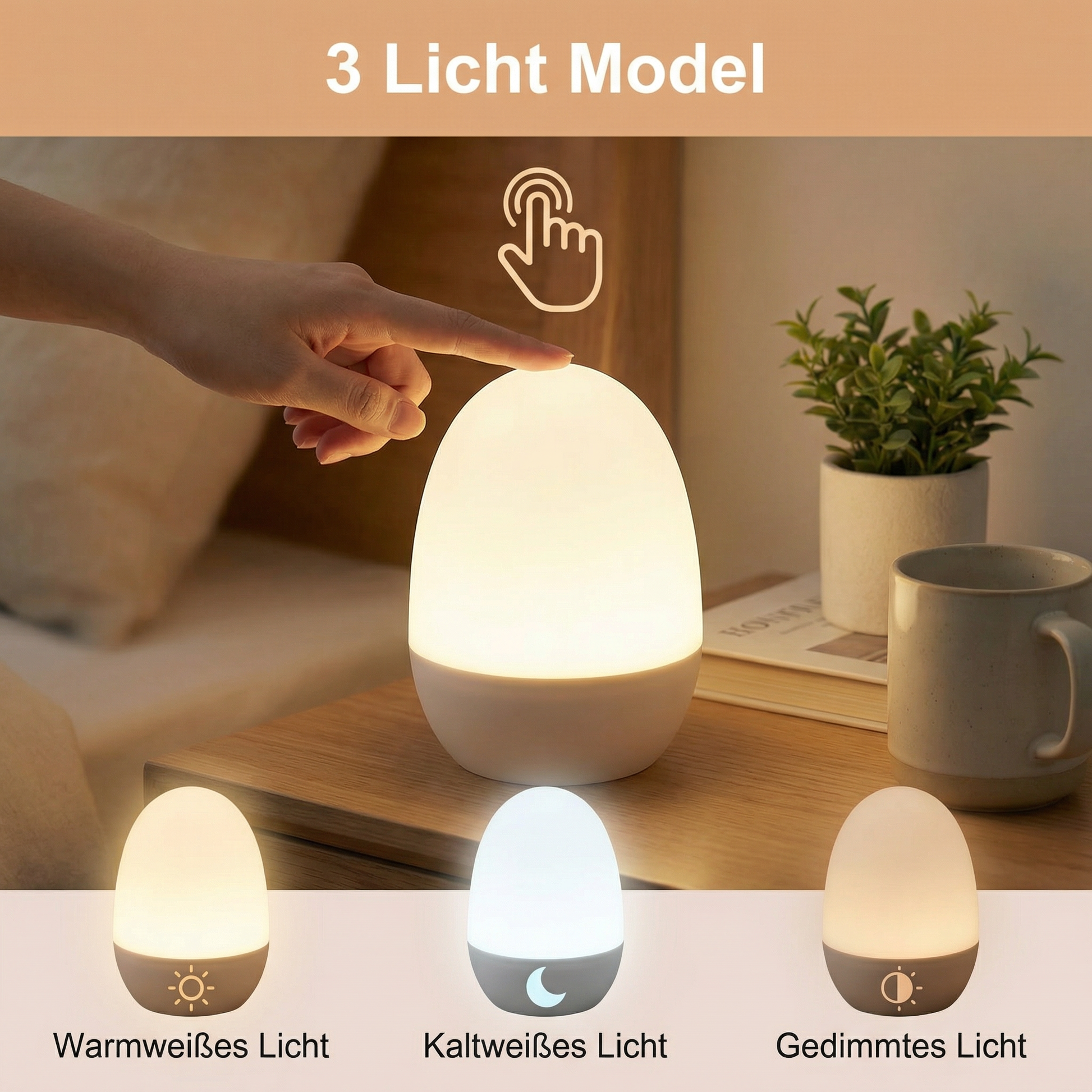 Das eiförmige Nachtlicht sieht super süß aus und passt perfekt ins Kinderzimmer. Die Touch-Dimmung funktioniert zuverlässig und die Farben wechseln angenehm weich.