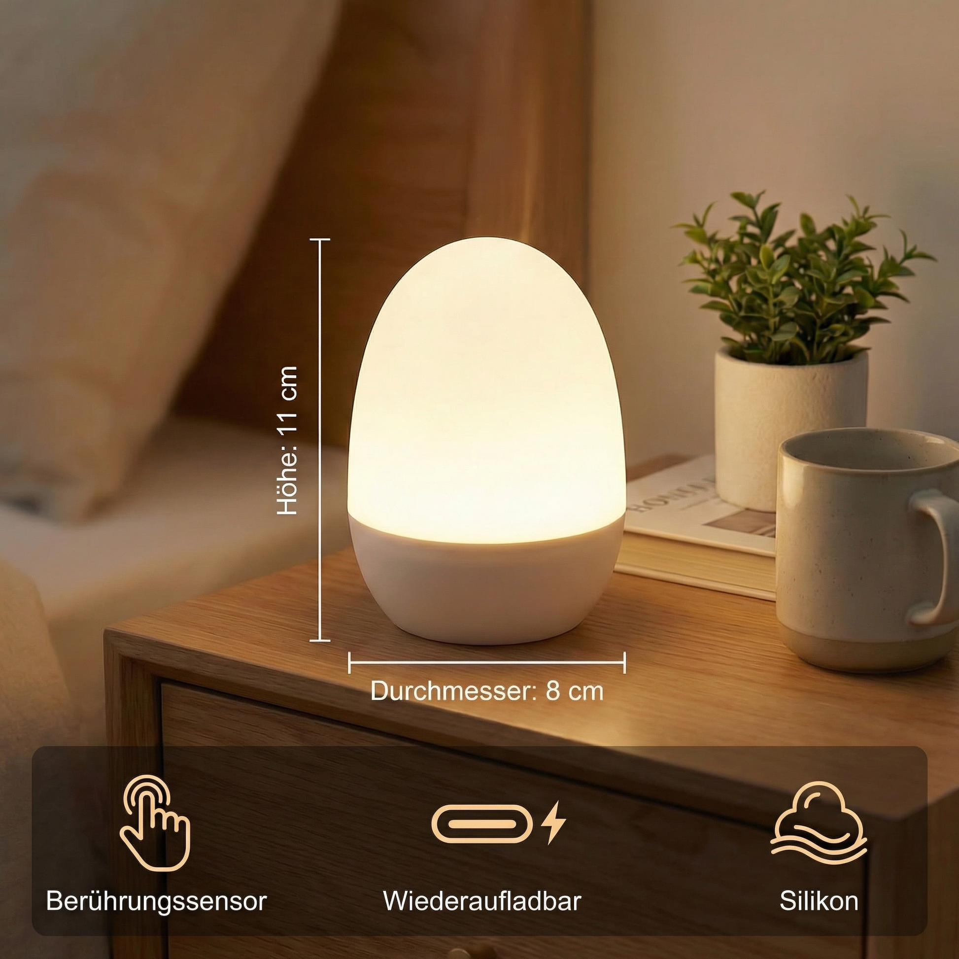 Dieses ei-förmige LED-Nachtlicht aus hochwertigem, weichem Silikon kombiniert zeitloses Design mit durchdachter Funktionalität. Es spendet ein angenehm gleichmäßiges, blendfreies Licht und eignet sich ideal als Nachtlicht, Orientierungslicht oder stimmungsvolle Beleuchtung für entspannte Abendstunden.