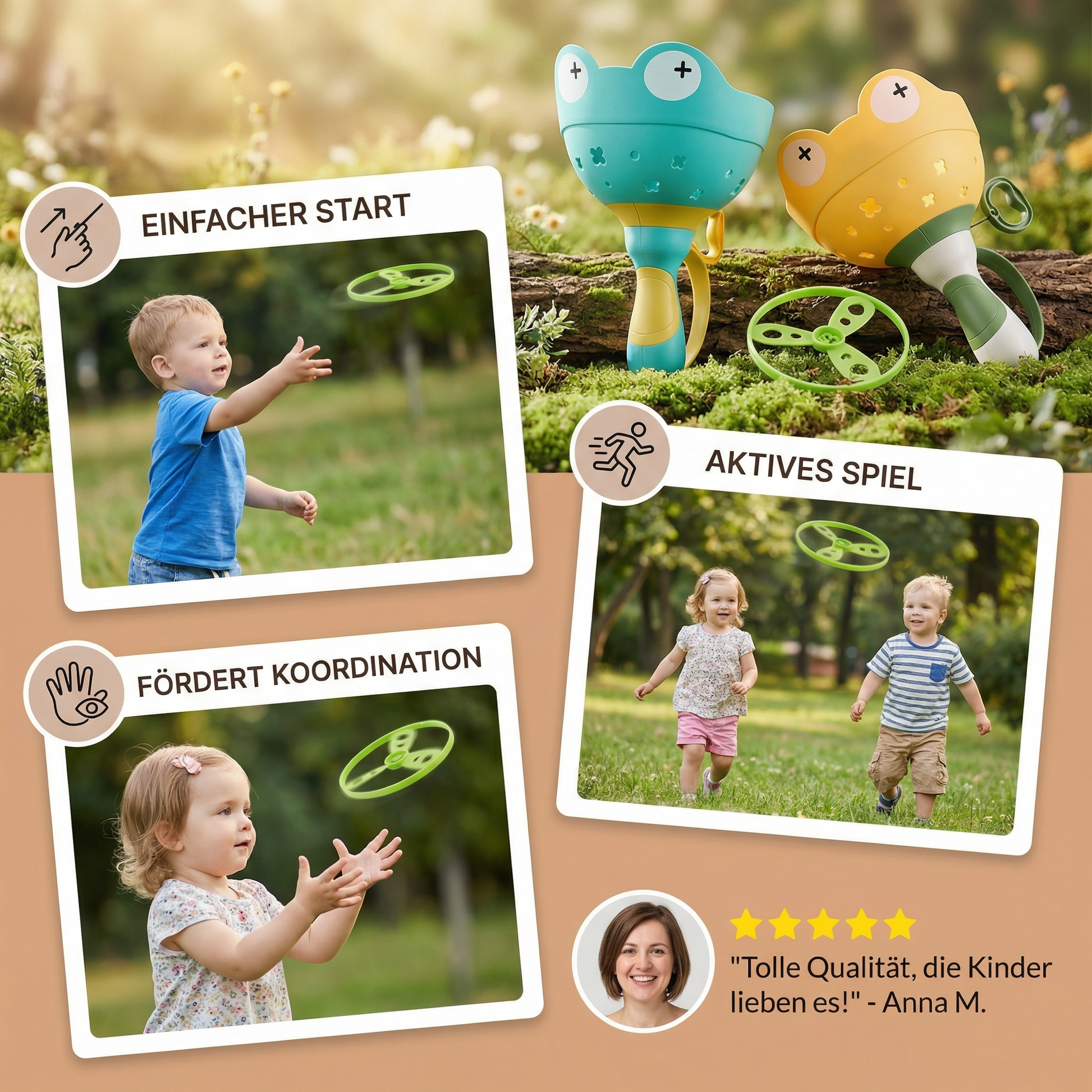 Kinder verbringen heute oft zu viel Zeit vor Bildschirmen. Das Flug-Propeller Spielzeug mit Schnurstarter bringt sie wieder in Bewegung – aktiv, kreativ und voller Freude! Es fördert Geschicklichkeit, regt die Fantasie an und ist ein tolles Gemeinschaftsspiel für Freunde und Familie.