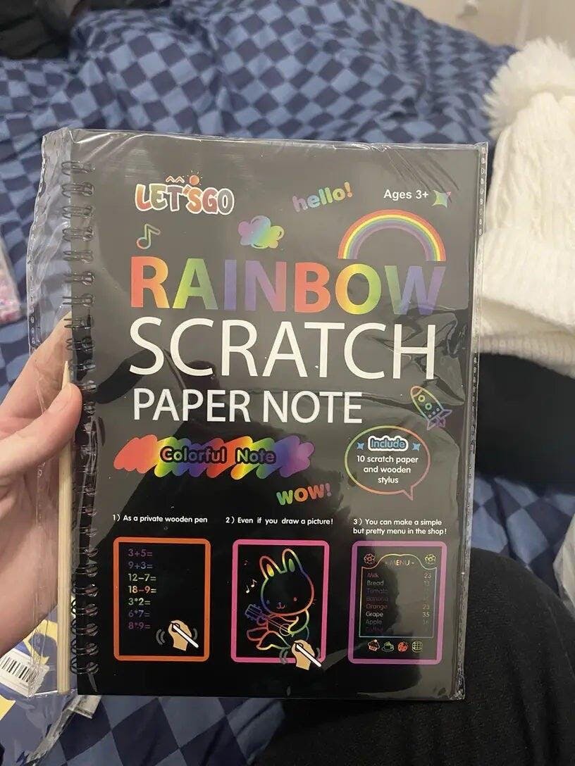 "Das Magische Regenbogen Kratz Papier begeistert meine Kinder jedes Mal aufs Neue, weil die bunten Farben so schön hervorkommen. Besonders praktisch finde ich, dass kein Stift oder Farbe nötig ist und trotzdem kreative Kunstwerke entstehen."