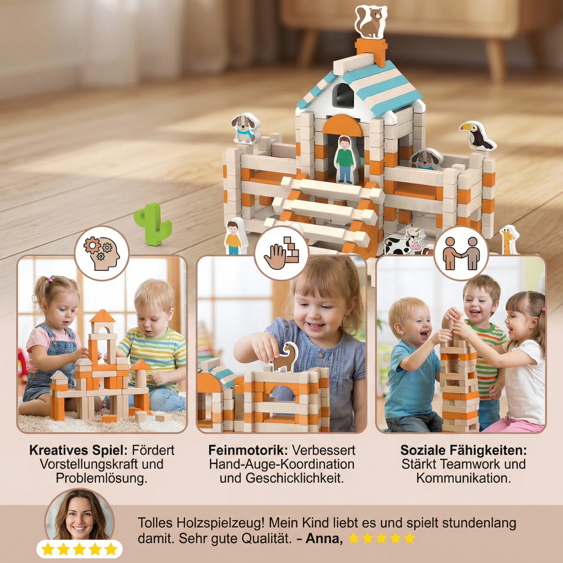 "Das Montessori Holz-Baustein Set ist wunderschön verarbeitet und fühlt sich richtig hochwertig an. Besonders gut gefällt mir, dass meine Kinder damit stundenlang spielen und dabei Konzentration und Geschicklichkeit ganz von selbst trainieren."