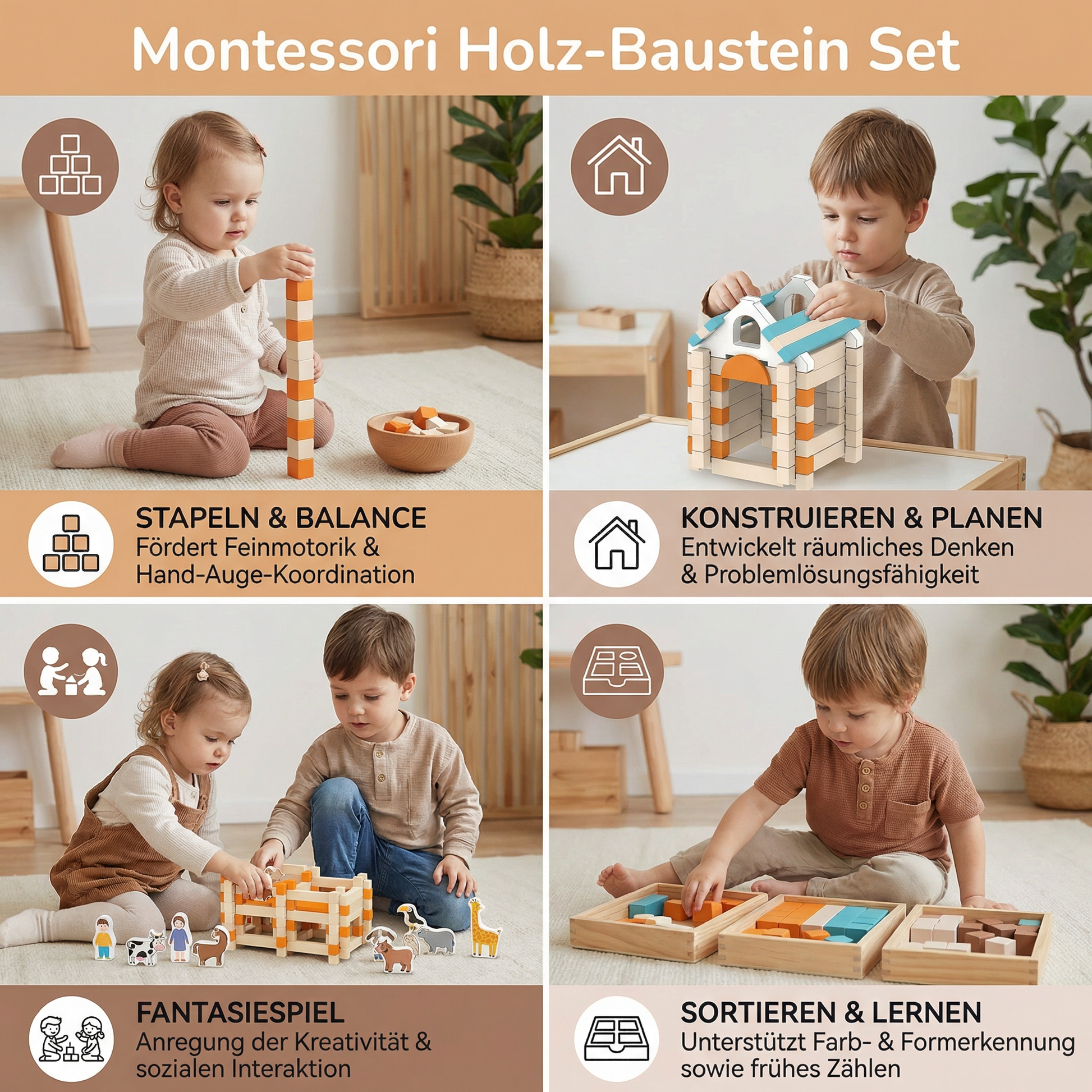 Natürlich spielen, kreativ lernen – Das Montessori Holz-Baustein Set für kleine Entdecker!
